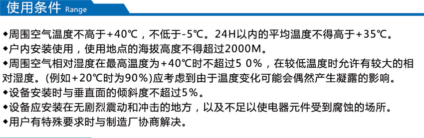 裝置適用于發(fā)電廠、石油、化工、冶金、紡織、高層建筑等低壓配電系統(tǒng)。海拔高度不超過1000m;周圍環(huán)境溫度-25℃ - +40℃;無導(dǎo)電性塵埃、腐蝕性氣體和水蒸氣的場所;無火災(zāi)和爆炸危險的場所;無經(jīng)常性劇烈震動場所。